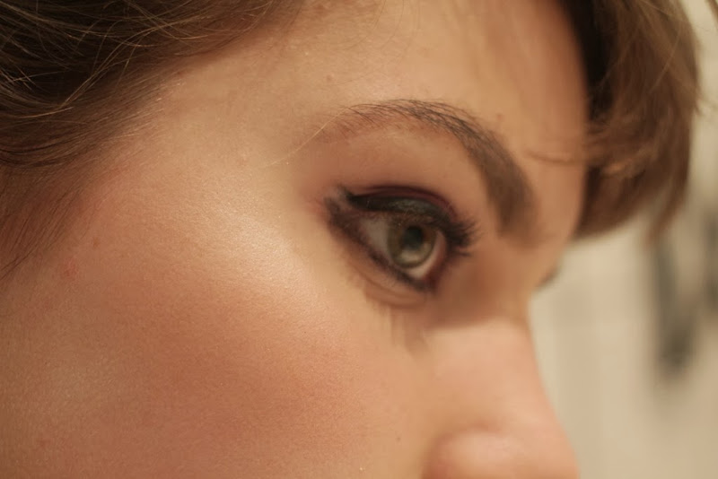 4 Après avoir estompé les ombres à paupières vers le coin extérieur, j’ai tracé avec un eye-liner liquide une ligne suivant la base des cils jusqu’au 4/5 de l’œil. À ce point, j’ai légèrement incliné le trait vers mes tempes.